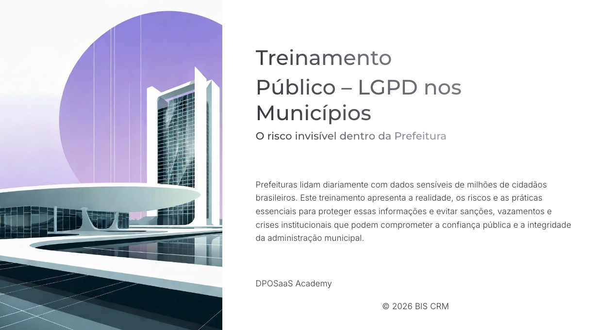 Este treinamento foi desenvolvido especialmente para servidores públicos municipais, com uma abordagem simples e prática sobre a aplicação da LGPD no dia a dia da administração pública. O curso explica os conceitos essenciais de proteção de dados, responsabilidades do setor público, limites do uso de informações pessoais e boas práticas para evitar riscos, sempre considerando o interesse público, a transparência e a rotina real dos órgãos municipais.